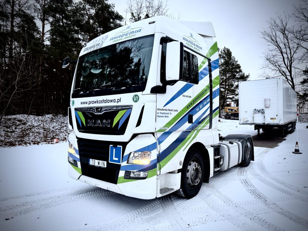 Szkolenie prowadzimy na nowoczesnym MAN TGX o mocy 500 KM, wyposażonym w automatyczną skrzynię biegów, co znacząco zwiększa komfort nauki oraz pozwala kursantom skupić się na technice jazdy i precyzyjnym manewrowaniu.